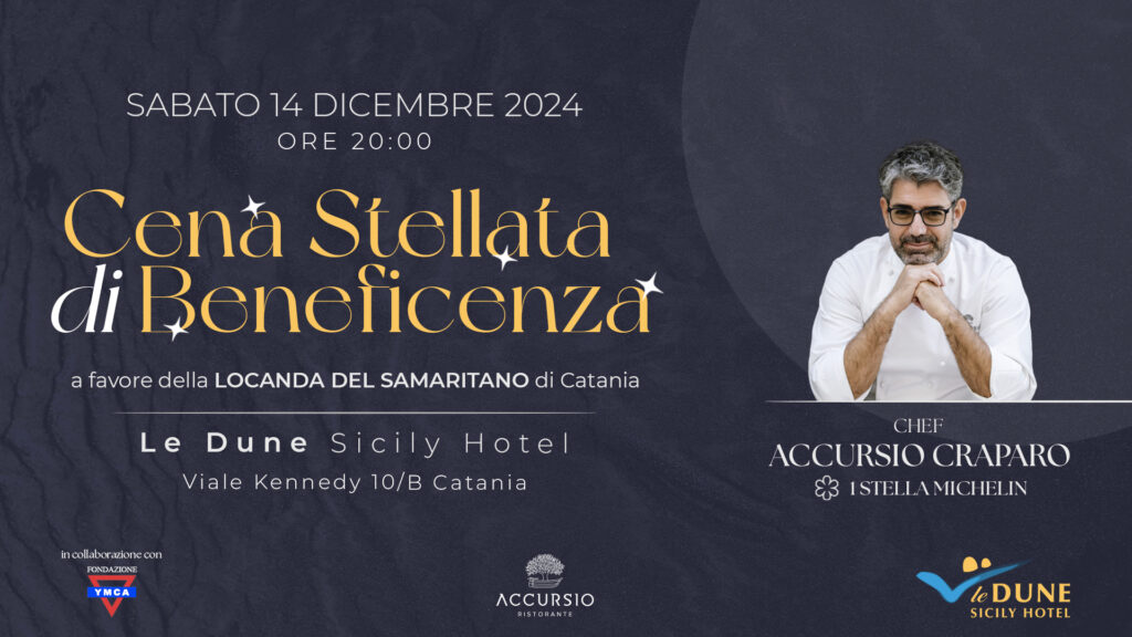Immaginate una serata speciale, dove i profumi della cucina stellata incontrano la magia di un tramonto sul mare. Sarà questa l’atmosfera che vi accoglierà il prossimo 14 dicembre alle ore 20:00, nel salone principale panoramico de Le Dune Sicily Hotel di Catania, (Viale Presidente Kennedy 10/b). Una cornice suggestiva, scelta dalla Fondazione Ymca Italia per ospitare una cena stellata di beneficenza, guidata dallo chef Accursio Craparo, simbolo dell’eccellenza culinaria siciliana e premiato con una stella Michelin.