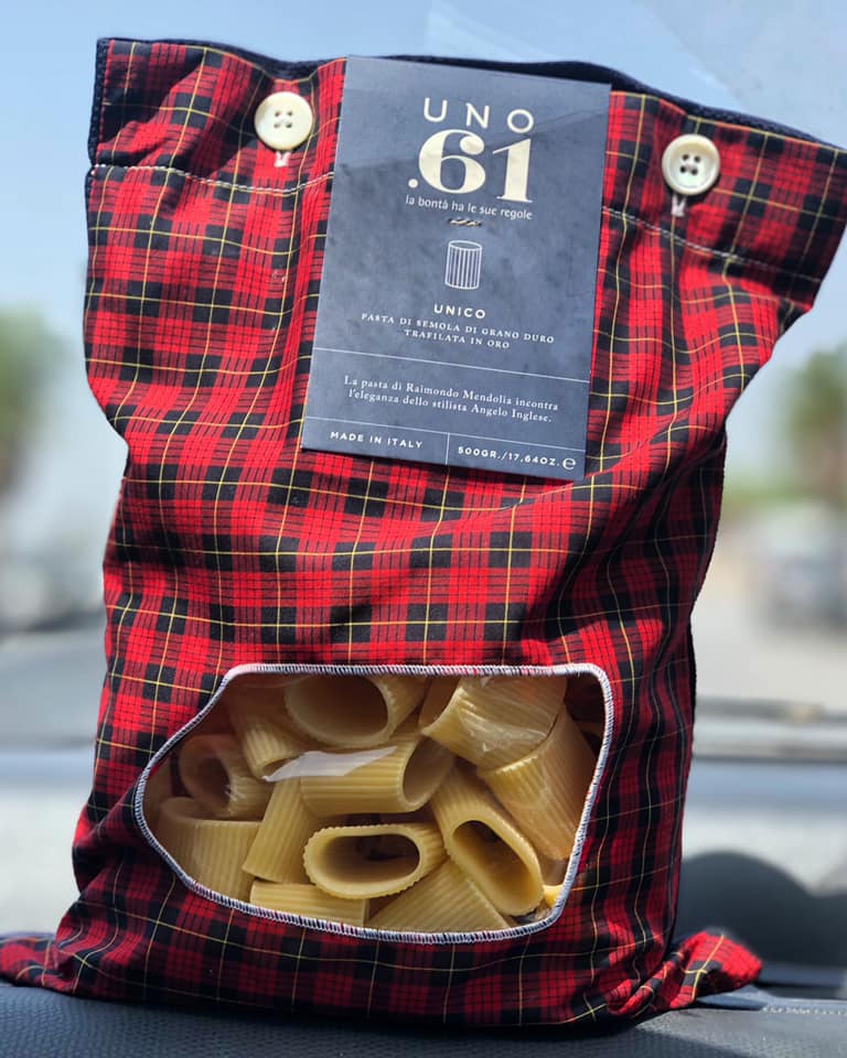 Molto particolare è la confezione della pasta. Essa è racchiusa nelle pregiate stoffe sartoriali, cucite a mano, di Angelo Inglese, artigiano della camiceria italiana a cui è affidata anche una parte del guardaroba del Buckingham Palace. Giocando sull’idea delle “mezze maniche” vestite con una “camicia” d’eccezione, Inglese ha ideato un packaging che diventa un piacevole sorpresa per gli occhi e il tatto. Per realizzarlo, impiega solo di ritagli di camicie cuciti completamente a mano e chiusi con bottoni in puro corozo, personalizzabili con svariati ricami. Perché anche la sostenibilità è un prezioso ingrediente di Uno.61.
